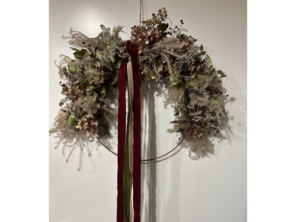 Použitý materiál: kovový kruh, sušené květiny jako (statice, hortensie, pampová tráva, len, makovice a travičky)