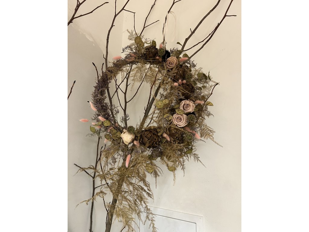 Použitý materiál: kovový kruh, sušené květiny jako (statice, artičok, asparagus, penízek, scabiosa a travičky)